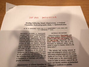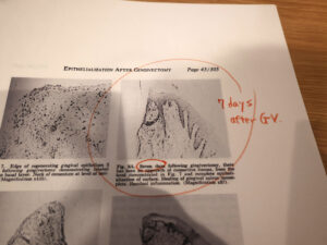 実に60年前の論文の再読。アカゲザルに歯肉切除術を行い屠殺前にチミジンのラベリングを行って組織学的に治癒を追跡している。3mmの開放創が5~7日で上皮化が起こっているので、1日あたり0.5mmのスピードということになる。