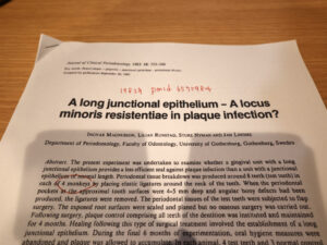 40年以上前の超クラッシックな論文を再読。この頃は動物実験が結構多い。本論文ではサル。結果、接合上皮が長くてもそうでなくてもプラークに対する反応に差はなかった。1981年のレビュー論文の中で、Barringtonが『LJEは弱い』と書いていたことへのアンチになっている(2度も出てくる)。個人的にBarringtonには嫌な思いをしたことがあるので、本論文は好意的にみてしまう。ぜんぜん科学的じゃないけど、、、